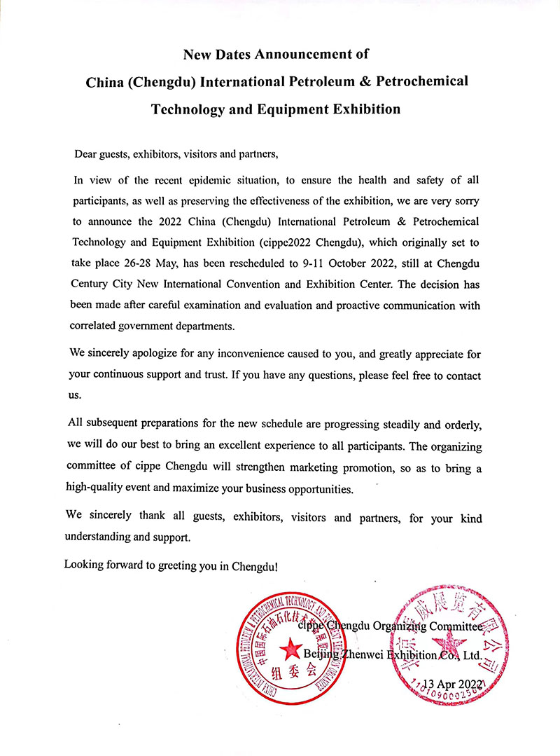 New Dates Announcement of China(Chengdu) International Petroleum & Petrochemical Technology and Equipment Exhibition