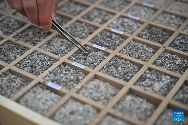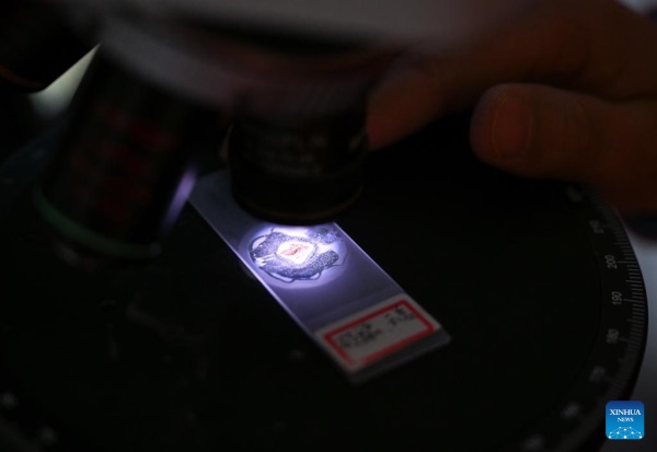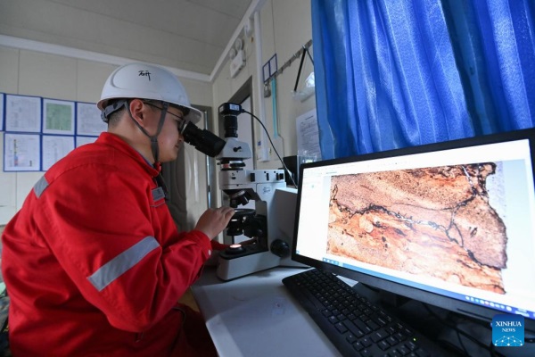 A researcher looks at samples collected from deep earth through a microscope at "Shenditake 1" borehole in the Taklimakan Desert in the Tarim Basin, northwest China's Xinjiang Uygur Autonomous Region, March 3, 2024. The drilling of a superdeep borehole in northwest China's Xinjiang Uygur Autonomous Region reached 10,000 meters at 2:48 p.m. Monday and is going deeper, marking a breakthrough in the country's deep-Earth exploration.